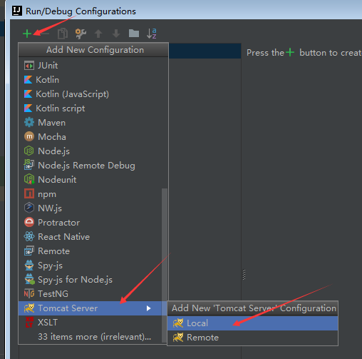 –> click the ‘+’ buttun -> Tomcat Server –> Local (if you can not find the ‘Tomcat Server’ iterm,then click the bottom item ‘33 items more(irrelevant)…’